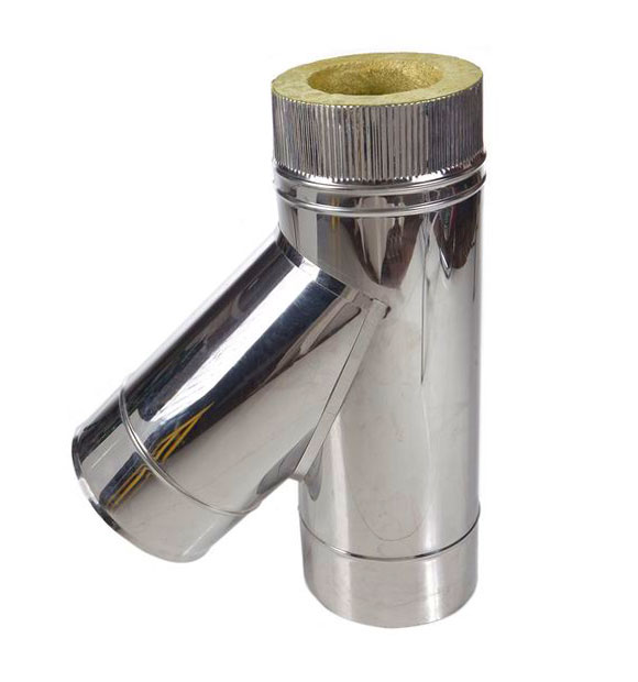 Тройник дымохода утепленный с косой врезкой. Угол наклона врезки 45 градусов. Произведен из нержавеющей стали толщиной 0,5 мм. Внутренний контур тройника выполнен из нержавеющей стали AISI 304, наружный контур из нержавеющей стали AISI 430. Толщина базальтового утепления 50 мм. Если вам требуется не стандартный диаметр или другая марка стали напишите нам и мы произведем ваш заказ в кратчайшие сроки.